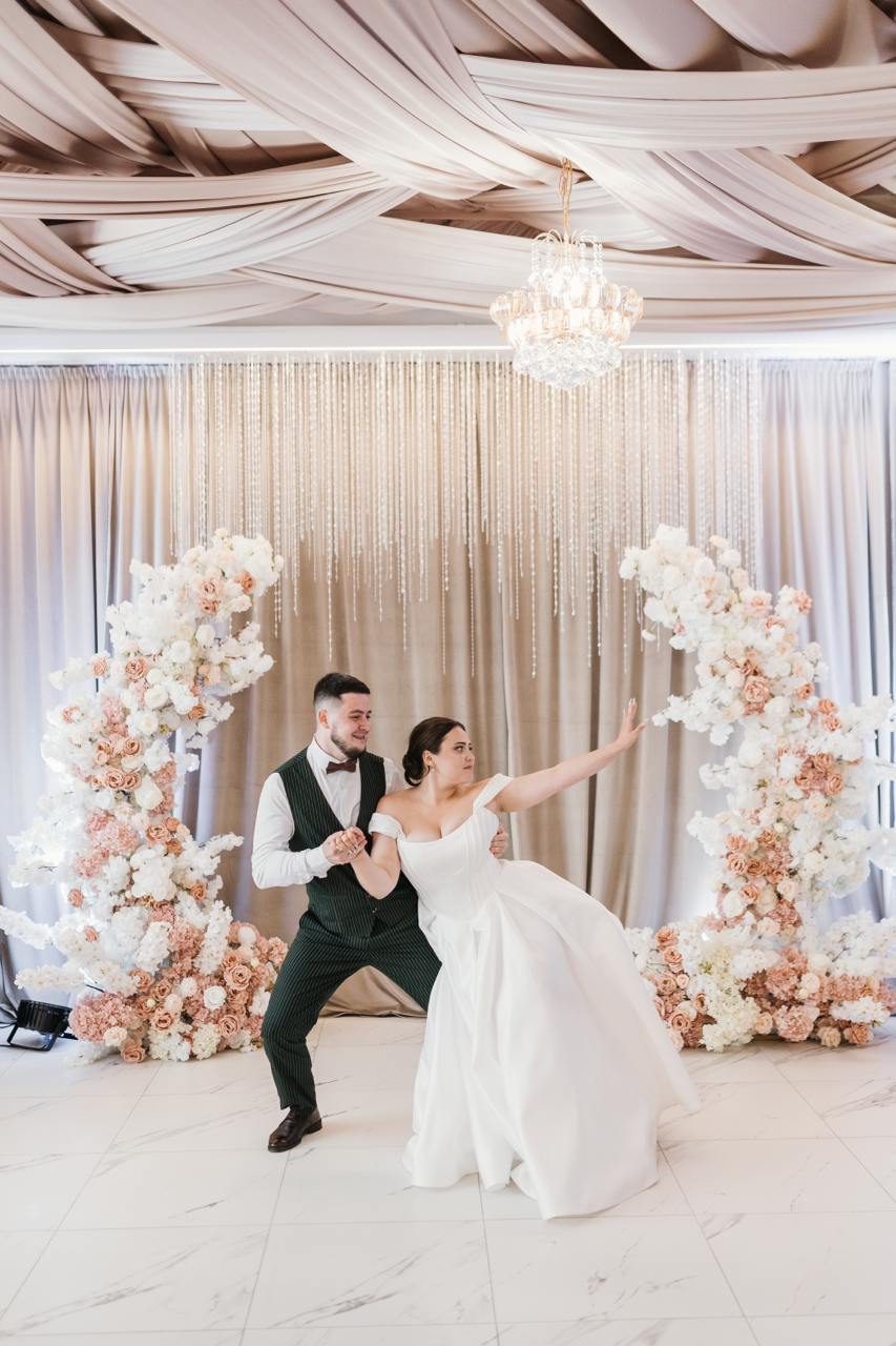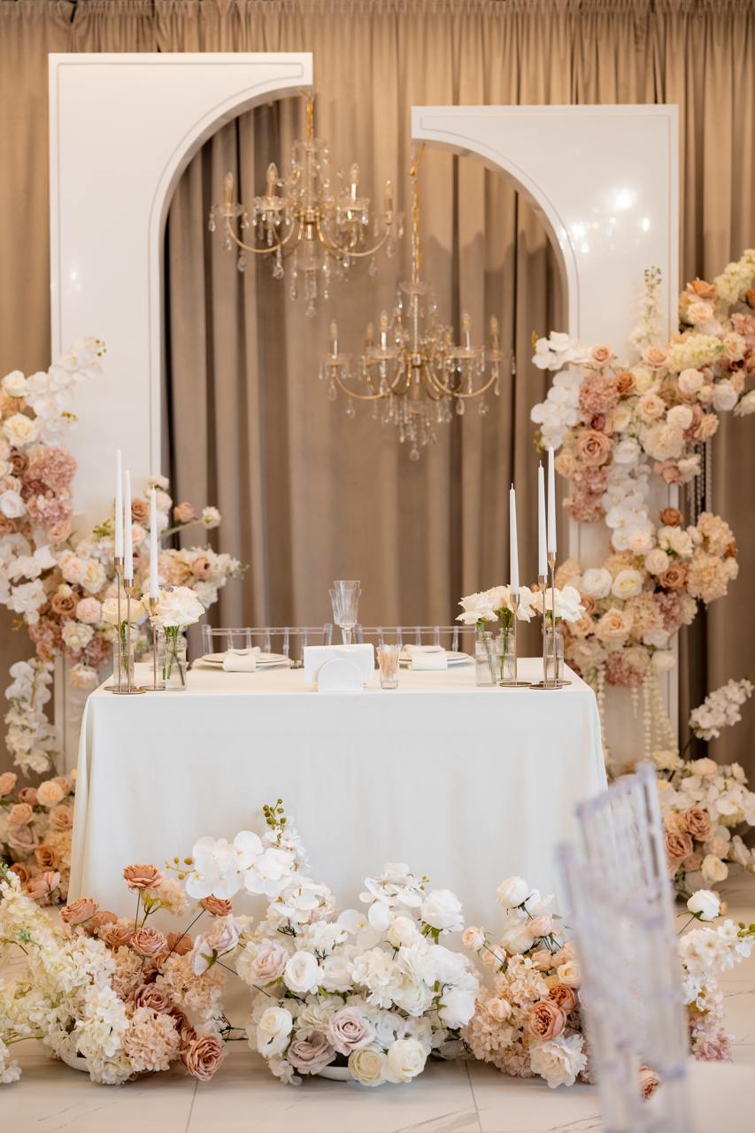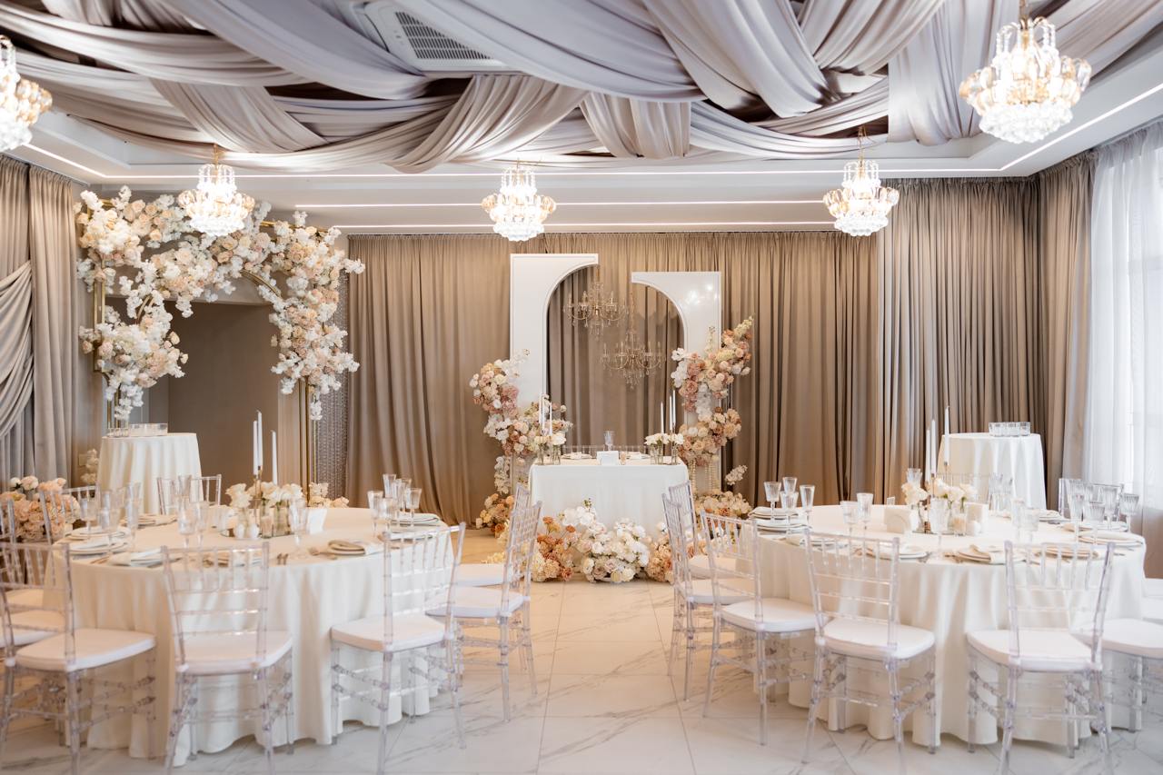 Інтер’єр виконаний у благородних теплих тонах: драпірована стеля, текстильні стіни, витончені квіткові композиції, прозорі стільці та круглі банкетні столи. Атмосфера залу створює відчуття затишку, приватності та преміального комфорту, водночас залишаючись універсальною для різних стилістик — від класики до сучасної романтики.