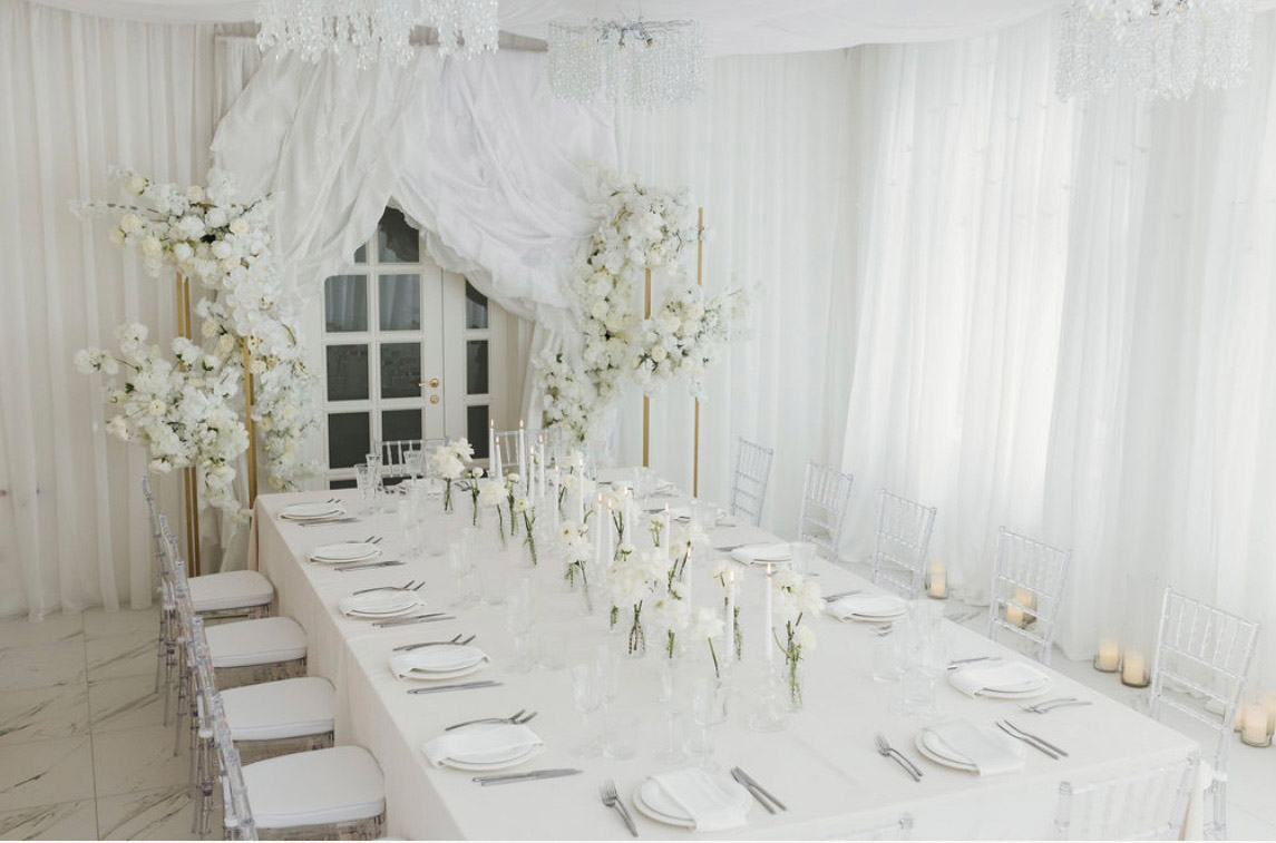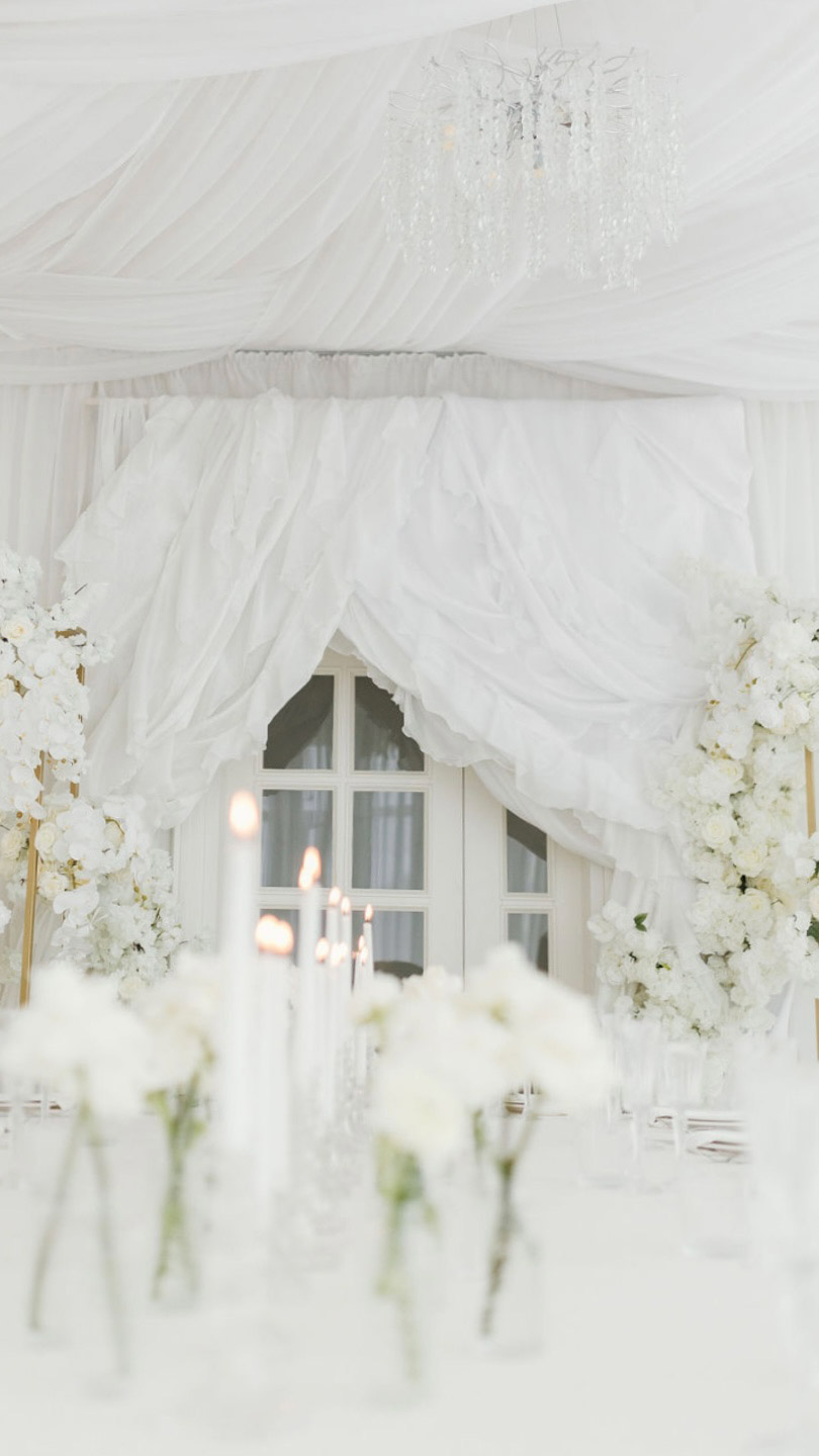 WHITE HALL — це світлий камерний простір для особливих подій. Зал оформлений у повністю світлій палітрі: текстильні драпірування стелі, кришталеві люстри, флористичні композиції в білих тонах, прозорі стільці та вишукане сервірування.